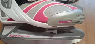 Se venden patines de hielo marca BladeRunner de Decathlon. Número ajustable 38-40. Son de color gris y rosa, con un diseño deportivo. - Cierre con cordones y velcro. - Bolsa para transporte incluida.