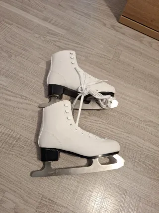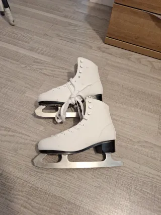 Patines de hielo blancos en muy buen estado, talla 34-35. - Diseño clásico y elegante. - Cierre con cordones para un ajuste seguro. - Cuchillas de acero inoxidable.