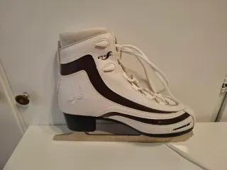 Patines de hielo blancos con detalles en marrón oscuro. Cierre con cordones. - Talla 41. - Diseño deportivo. - Hoja de patín de metal.
