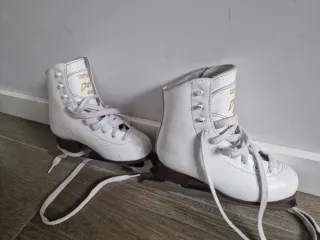 Par de patines de hielo blancos, perfectos para patinaje artístico. - Diseño clásico y elegante. - Cierre con cordones para un ajuste seguro. - Cuchillas de metal resistentes.