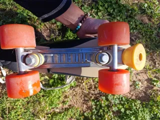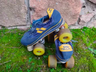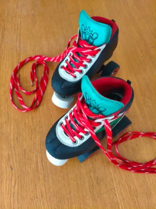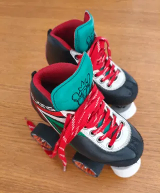 Patines quad clásicos de piel marca Skater (Portugal) en muy buen estado de conservación. Bota de cuero negro con detalles en blanco, estructura robusta y cómodos. Ruedas y ejes en buen estado, giran perfectamente. Presentan leves marcas de uso en la puntera y laterales propias del uso normal, pero sin roturas ni defectos estructurales. Talla aproximada: EU 41 Longitud interior (plantilla): 26,5 cm Modelo vintage/recreativo, muy resistentes y con estética clásica. Perfectos para patinar de forma ocasional, coleccionismo o decoración. Incluye bolsa.