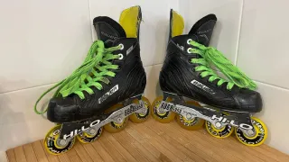 Patines de hockey en línea Bauer para jóvenes. Talla 34 - Patines de hockey en línea. - Marca Bauer. - Cordones verdes. - Ruedas Hi-Lo.Delanteras nuevas, traseras buen estado. - Chasis Youth Large. Limpio y a punto.
