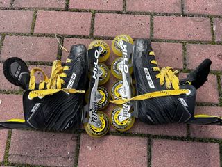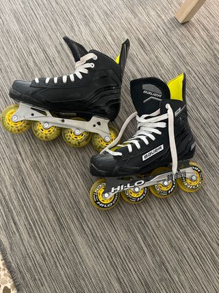 Patines de hockey Bauer en color negro con detalles en amarillo. - Diseño inspirado en patines de hockey sobre hielo. - Ruedas Hi-Lo. - Cierre con cordones blancos.