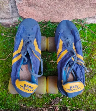 Patines de hockey Keds Team en color azul y amarillo. - Diseño deportivo. - Ideal para principiantes. - Número 37. - El patín derecho tiene un pequeño parche para una reparación en la lona.