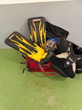 Conjunto de equipamiento para portero de hockey sobre patines Junior (14-15 años) - Incluye protecciones Protex con diseño de llamas. 25€ - Casco de portero azul con rejilla. 50€ - Peto protector. 25€ - Guantes de portero. 25€ - Bolsa de transporte roja. 50€