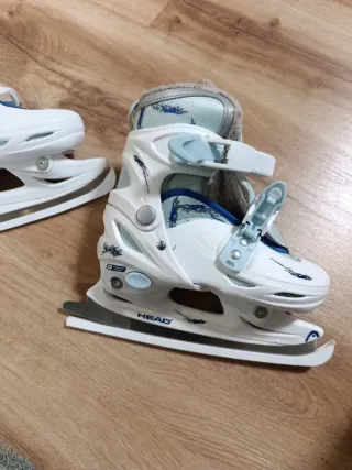 Se venden patines de hockey blancos con detalles en azul. Son ajustables para adaptarse de talla 30-33 - Cierre con hebillas. - Diseño deportivo. - Marca HEAD.