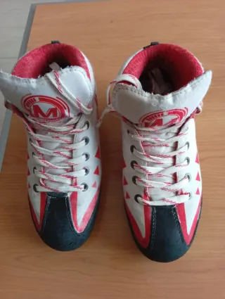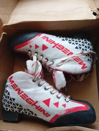 Patines de hockey de la marca Menghini. - Diseño blanco con detalles en rojo y negro. - Cierre con cordones.