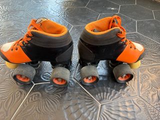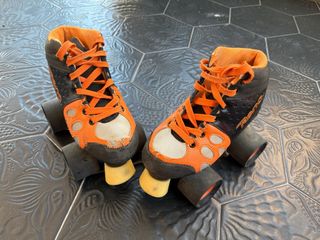 Se venden patines de hockey de segunda mano en color negro con cordones naranjas. Talla 37 - Marca: BAROVARI - Cordones naranjas - Ruedas amarillas y rojas
