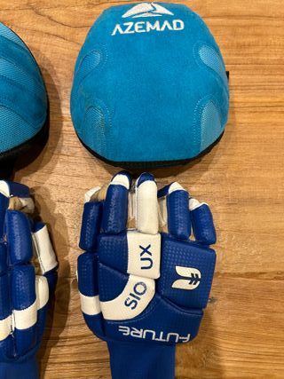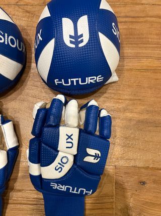 Par de guantes de hockey sobre patines de la marca Sioux, modelo Future. - Color azul y blanco. - Diseño ergonómico para mayor protección. - Cierre de velcro ajustable.
