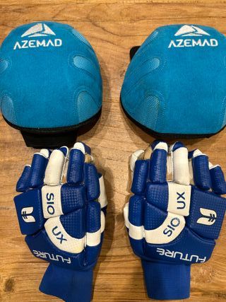 Pack de rodilleras y guantes para hockey sobre patines. El color principal es azul con detalles blancos. - Rodilleras de color azul. - Guantes de color azul y blanco.