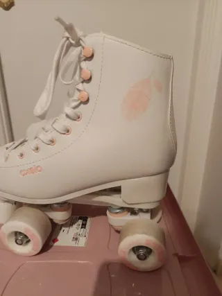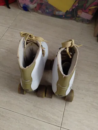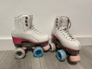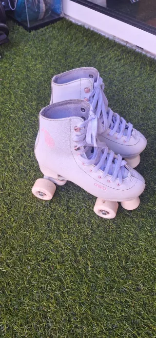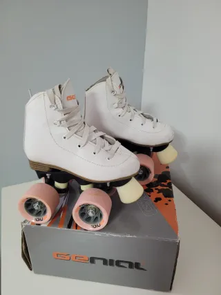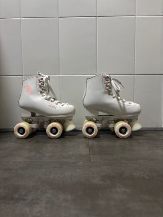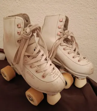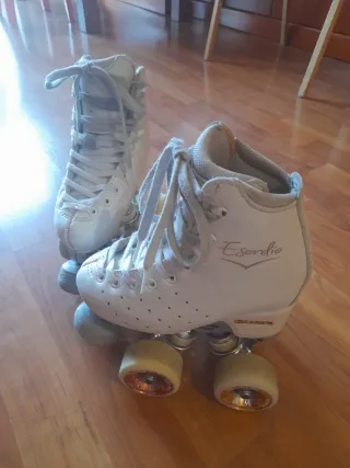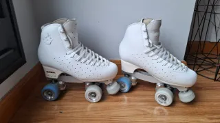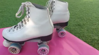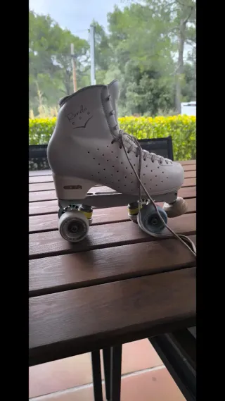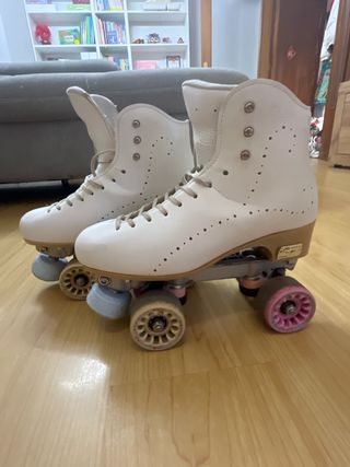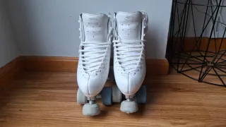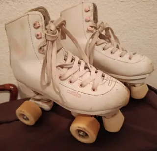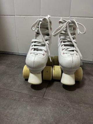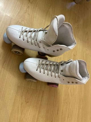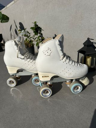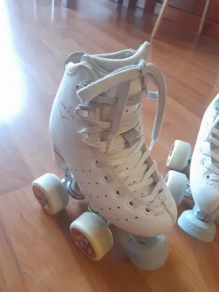 Patines artisticos 4 ruedas de color blanco, talla 35. Han tenido muy poco uso y se encuentran en excelente estado. - Diseño clásico y elegante. - Cierre con cordones blancos.