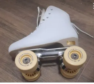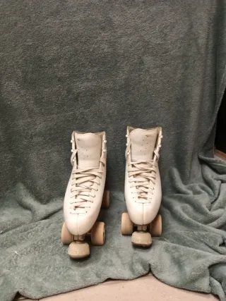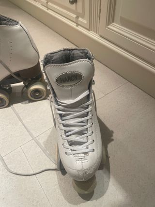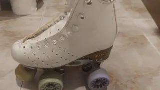 Patines artísticos blancos de cuatro ruedas en buen estado. - Diseño clásico y elegante. - Cordones resistentes para un ajuste seguro. - Ruedas y freno nada desgastados