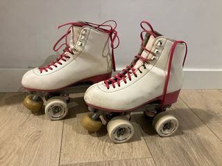 Patines artísticos de cuatro ruedas en color blanco. Han sido usados pero están en perfecto estado. En lo único que se nota es en el freno que está un poco desgastado por delante. - Talla 36. - Cierre con cordones. - Diseño clásico.