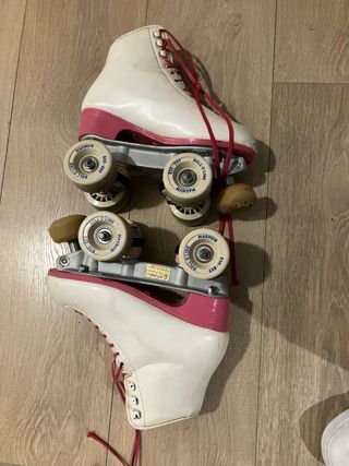 Patines de cuatro ruedas diseñados para patinaje artístico. Su diseño combina el blanco con detalles en rosa. Talla 36 - Cierre con cordones rojos. - Botas altas de cuero sintético. - Ruedas de poliuretano. Van bien para iniciarse en patinaje