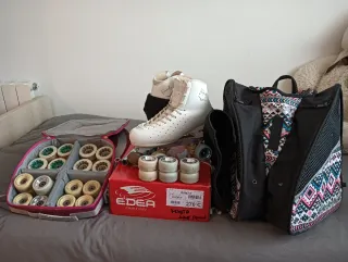 Patines profesionales de patinaje artístico. Bota Edea Brío talla 225 en muy buen estado, plantilla interior nueva, muy poco uso (1 temporada), algún roce del uso que se ve en las fotos. Plantilla roll-line mirage II talla 12 en perfecto estado Cada patín lleva 2 ruedas roll-line Magnum 57d y 2 ruedas star 40-57 Regalo 2 cubre botas usados pero aún le quedan vida Precio negociable