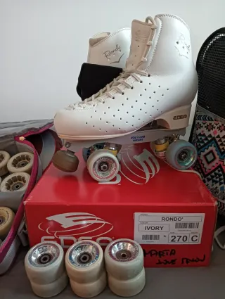 Patines Rondó blancos. Patinaje artístico de competición. - Talla de bota 255=38 - Plancha variant talla 150. - Patines profesionales. - Cordones nuevos. - Ruedas Magnum diámetro 57. Dureza 49. - Solo tiene unas rozaduras en las punteras el resto perfecto. Ver fotos.