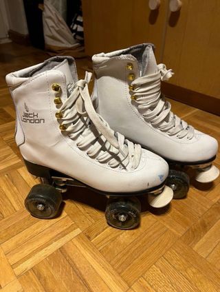 Patines de patinaje artístico Jack London. - Talla 38. - Color blanco con detalles dorados. - Cierre con cordones. - Con poco uso. Solo tienen un rozon que se ve.