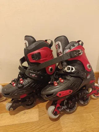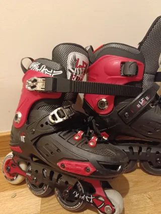Patines de ruedas para patinaje artístico, ajustables para tallas 36 a 39. Diseñados para ofrecer estabilidad y control. - Cierre de velcro y cordones. - Ruedas de alta resistencia. - Diseño en negro y rojo.