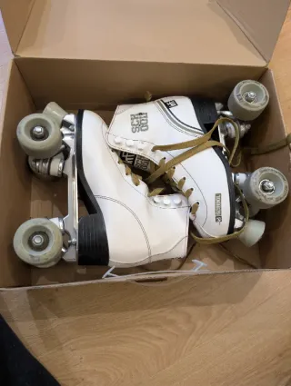 Vendo patines de cuatro ruedas (quad) marca KRF, modelo Roller Classic en color blanco con detalles dorados. Están en muy buen estado, ideales tanto para iniciación como para patinaje artístico o paseo. "Se pueden ver y probar sin compromiso en Las Cabañuelas. Están impecables, tal cual se ve en las fotos." -"Precio rebajado a 30 € (no negociable - Me ha regalado mi amiga ucraniana,pero no se patinar - Lo vendo quien sabe patinar bien - Los frenos funcionan bien -No hay funda de eso - No hago envios