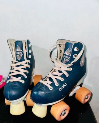 Patines de la marca Oxelo en color azul, diseñados para patinaje artístico. - Diseño moderno con detalles de plumas. - Cierre con cordones para un ajuste seguro. - Ruedas de color rosa y blanco. Falta 1 cordon.