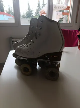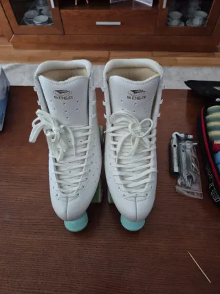 Se venden patines de patinaje artístico en color blanco usados. Ideales para practicar este deporte. - Bota: Edea Motivo - Plancha: Rol-line Variant M - Talla: 250 = 37.5 - Ruedas: magnum 53D / Magnum 57D - Freno: komplex Diseño de bota alta para mayor soporte y cierre con cordones.