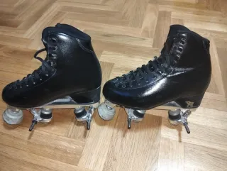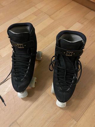 Patines de patinaje artístico en color negro. Se encuentran en excelente estado, prácticamente sin uso. - Diseño alto tipo bota. - Sin uso. - Protectores de puntas incluidos (pueden quitarse) - Talla 40/41 - Cordones negros. - Ruedas de color translúcido.