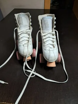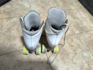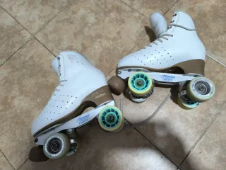 Patines marca Tijuana. Tiene algo de uso pero están genial para empezar en el mundo del patinaje artístico. Talla 37 Incluye bolsa para llevales. - Diseño clásico. - Cierre con cordones. - Ruedas de patinaje.