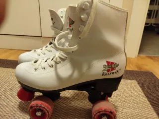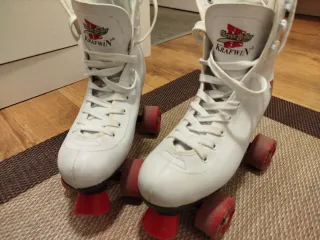 Patines blancos de estilo clásico, ideales para patinaje artístico. - Diseño alto tipo bota. - Cordones blancos. - Ruedas rojas. - Logo Classic Roller Krafwin en el lateral. -tiene alguna rozadura y desgaste en freno y ruedas. Pero le quedan muchas horas de patinaje para tener que sustituirlos
