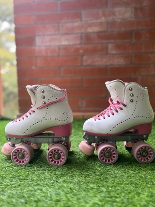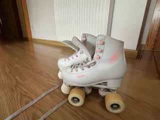 Patines artísticos de cuatro ruedas para niños, talla 33. Diseñados para ofrecer estabilidad y diversión. Usados 6 meses. Normalmente hay que llevar mínimo una talla más de lo que calce el niño. - Color blanco con detalles en rosa. - Cierre con cordones. - Ruedas de color crema.