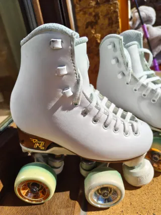 Patines artísticos Venus 230 en color blanco. Diseñados para patinaje artístico. - Bota Risport Venus 230 equivalente a 34.5 - plancha Qskate 140 - Ruedas de parquet Giotto dureza D47 - Cordones blancos nuevos Edea
