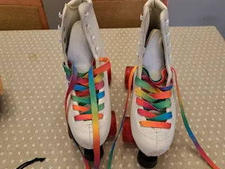 Se venden patines artísticos de 4 ruedas Rookie, ideales para iniciarse en el patinaje. Incluyen protecciones sin estrenar - Patines blancos con cordones arcoíris. - Ruedas rojas. - Incluye juego de protecciones.
