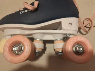 Patines artísticos Oxelo en color azul marino y rosa. - Talla 33. - Cordones y ruedas en color rosa. - Marca Oxelo.