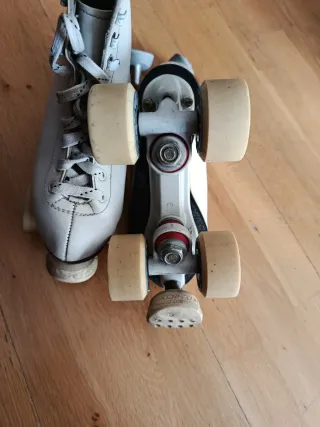Vendo patines artísticos de 4 ruedas en piel blancos, en buen estado, un freno desgastado , se puede sustituir.