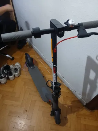 Se vende patinete eléctrico - Color negro. - Diseño plegable. - Ruedas con detalles rojos. Autonomía entre 20/25km Velocidad máxima 30km/h Tarda en cargarse unas 5.horas. La rueda delantera es con cámara, la de detrás se pincho y la cambie y le puse una sin cámara antipinchazos. Funciona perfectamente, lo vendo porque me han regalado uno nuevo. Tiene roto el guardabarros trasero, no interfiere para nada a su funcionamiento, es más bien estético.