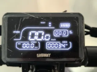 Patin eléctrico marca Sabway con batería de litio. Batería de 48V 13Ah Litio Tiempo de carga entre 7-8 horas Velocidad limitada de fábrica a 25 Km/h por normativa VMP. Autonomía Hasta 45 Km Peso neto 27 Kg Peso bruto 29 Kg Carga máxima 120 Kg Rueda neumática de 10" Tubeless Freno de disco delantero y trasero. Freno regenerativo KERS. Doble Motor Brushless Potencia de 600W x 2 nominal, 2016W potencia máxima Amortiguadores Doble delantero y trasero Cargador 54,6V 2A Bocina, luz LED, intermitentes App por bluetooth