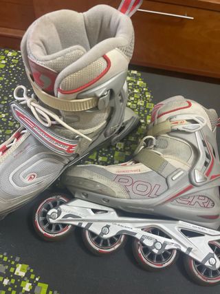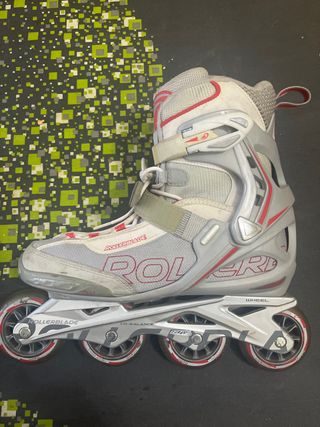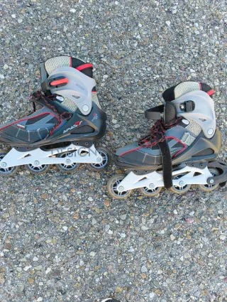Patines en línea Rollerblade, talla 40,5 aunque yo uso un 39 y es mi número. Color gris y rojo. - Ruedas de 77.5 mm. - Sistema Lo-Balance. - Cierre de velcro y cordones.