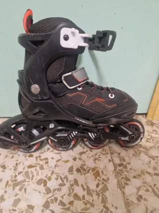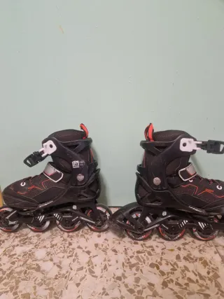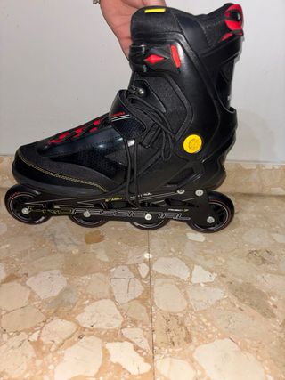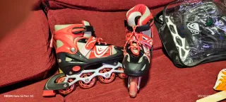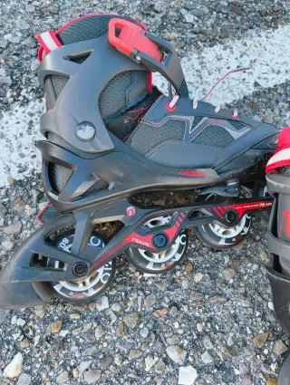 Se venden patines en línea en color rojo y negro. Son ajustables para adaptarse a diferentes tallas. Solo se han usado 2 veces. - Diseño deportivo. - Cierre de velcro y hebilla. - Ruedas de goma.