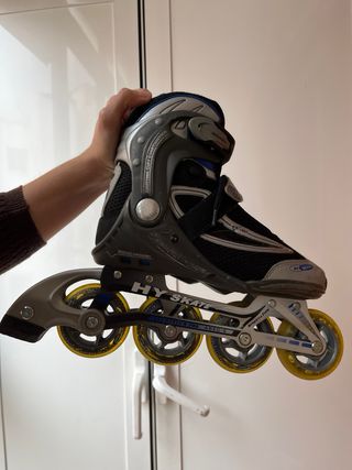 Patines en línea de la marca Rollerblade, diseñados para ofrecer comodidad y rendimiento. - Diseño en gris y azul. - Cierre con velcro, cordones y hebillas. - Ruedas Rollerblade.