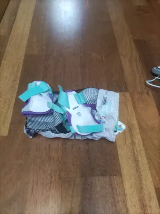 Patines en línea en color blanco, gris y turquesa. Con bolsa incluida. Rodilleras coderas y muñequeras Tengo dos pares precio por casa uno. Talla 33-35 - Cierre de velcro y hebilla. - Ruedas de poliuretano. - Bota acolchada para mayor comodidad.