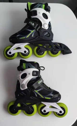 Patines en línea de la marca Fila, ajustables, ideales para peques. Su diseño es moderno y llamativo. - N° 32 a 35 - Color negro con detalles en verde lima. - Cierre de velcro y hebilla. - Ruedas de color verde brillante. - Protecciones,(manos, codos y rodillas)