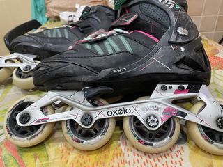 Se venden patines en línea Oxelo en color negro, rosa y verde menta. Son cómodos y resistentes. - Cierre con cordones, velcro y hebilla. - Ruedas de poliuretano. - Chasis de aluminio.
