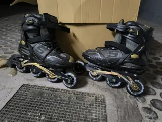 Se venden patines en línea en color negro con detalles dorados. Diseñados para ofrecer comodidad y estilo. - Cierre de velcro y cordones. - Ruedas de alta resistencia. - Diseño deportivo.