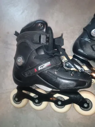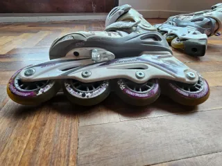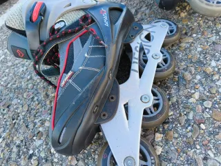Par de patines en línea de la marca Rollerblade. - Utilizado por última vez hace 25 años. En 2 ocasiones. - Talla 40 - Hay que ponerles ruedas. - Incluye las protecciones de rodillas y codos. - Peso aproximado: 5 Kl