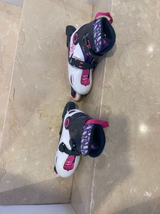 Patines en línea ajustables para tallas 32 y 33. Diseñados para ofrecer comodidad y estilo. - Diseño en blanco, negro y detalles en fucsia y morado. - Cierre con velcro y hebilla para un ajuste seguro. - Ruedas de patinaje en línea.