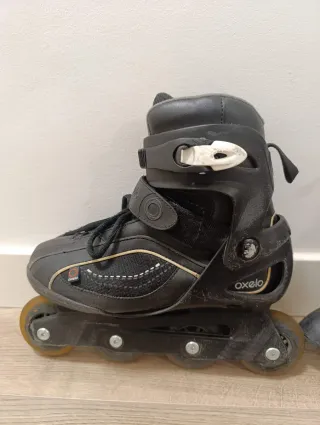 Patines en línea de la marca Oxelo en color negro. Diseñados para patinar con comodidad y estilo. - Cierre de velcro y hebilla. - Ruedas de poliuretano. - Bota acolchada. -Envio foto detallada ya que no tienen mucho uso de ve que las ruedas están perfectas y las botas también.Tiene roces de novato