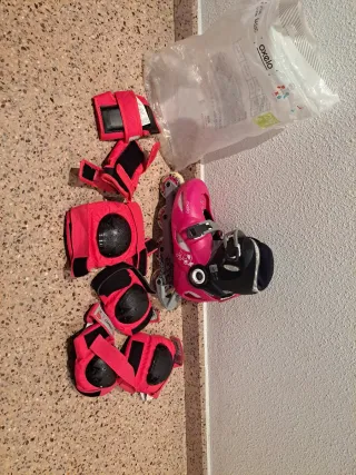 Set de patines en línea y protecciones para patinar de forma segura. El conjunto incluye un patín y un juego completo de protecciones. - Patín en línea color rosa. - Protecciones para rodillas, codos y muñecas. - Marca Oxelo. Talla xs