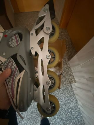 Patines en línea con un diseño en gris y amarillo. - Ruedas de poliuretano. - Cierre de velcro y hebilla. - Bota acolchada para mayor comodidad. Talla 36-38 ajustable. Tiene golpes pero se puede seguir usando, llevan años sin usarse.