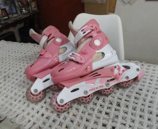 Patines en línea de la marca Mitical en color rosa y blanco. Son ajustables y se adaptan a tallas de la 34 a la 37. - Diseño con flores. - Cierres de velcro y hebilla.
