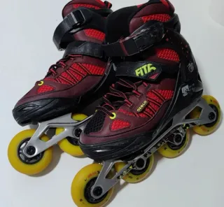 Patines en línea de la marca Fila, con un diseño deportivo en colores negro y rojo. -talla 42 - Ruedas de alta calidad. - Cierre de seguridad. - Diseño ergonómico.