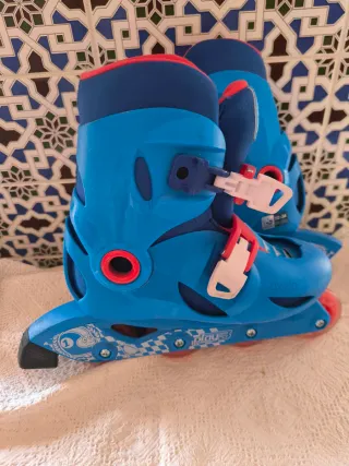 Patines en línea de color azul y rojo, ideales para los más pequeños. Son ajustables para adaptarse al crecimiento. - Talla 32-34. - Cierre de velcro y hebilla. - Ruedas de color rosa.